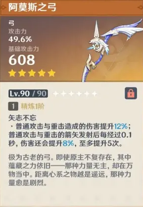 精炼(1/2/3/4/5)阶 矢志不忘 普通攻击与重击造成的伤害提升(12%/15%/18%/21%/24%);普通攻击与重击的箭矢发射后每经过0.1秒,伤害还会提升(8%/10%/12%/14%/16%),至多提升5次。 |