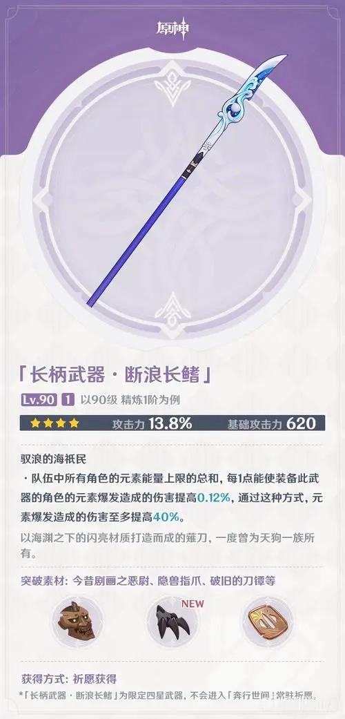以上便是小编为大家带来的原神长柄武器断浪长鳍满级属性介绍,和雷神、香菱比较适配,相信现在你已经了解到了断浪长鳍的属性,更多武器属性敬请关注大三软件站。