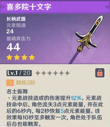 精炼(1/2/3/4/5)阶 名士振舞 元素战技造成的伤害提升(6%/7.5%/9%/10.5%/12%)。 元素战技命中后,角色流失3点元素能量,并在此后的6秒内,每2秒恢复(3/3.5/4/4.5/5)点元素能量。该效果每10秒至多触发一次,角色处于队伍后台也能触发。 |