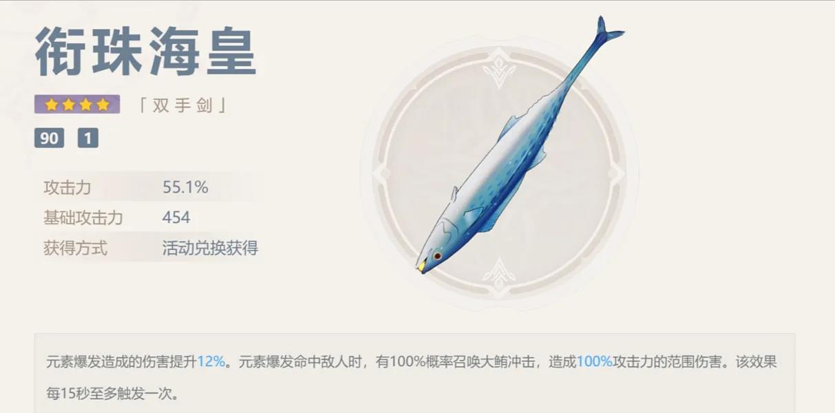 精炼(1/2/3/4/5)阶 海洋的胜利 元素爆发造成的伤害提升(12%/15%/18%/21%/24%)。 元素爆发命中敌人时,有100%概率召唤大鲔冲击,造成(100%/125%/150%/175%/200%)攻击力的范围伤害。该效果每15秒至多触发一次。 |