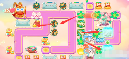4、第一轮打完之后,继续开图,从塔防那一列向两边开,桃树附近放置鱼刺和风扇,左侧大部分放置多重箭。
