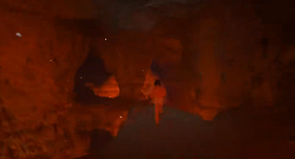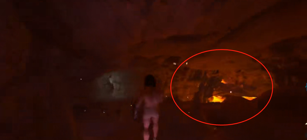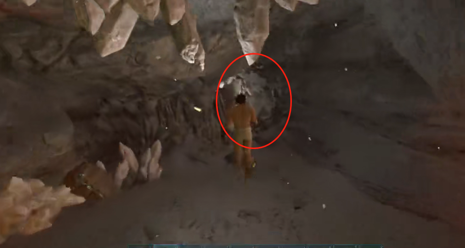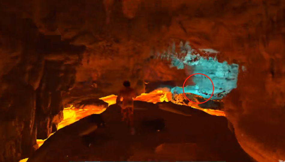 1、进入洞穴后一直往前走,在看到红色发光水晶后向右走,如图所示。