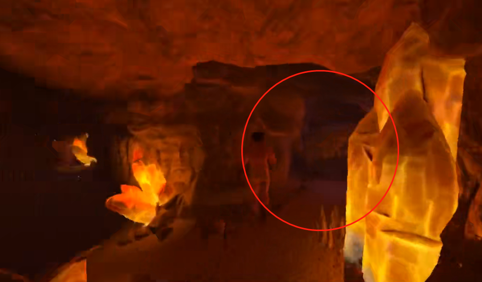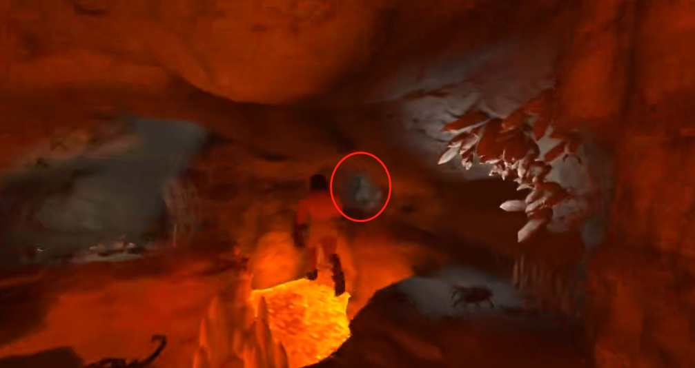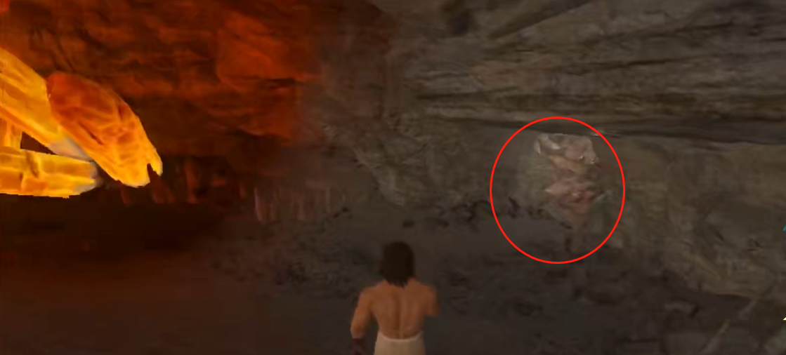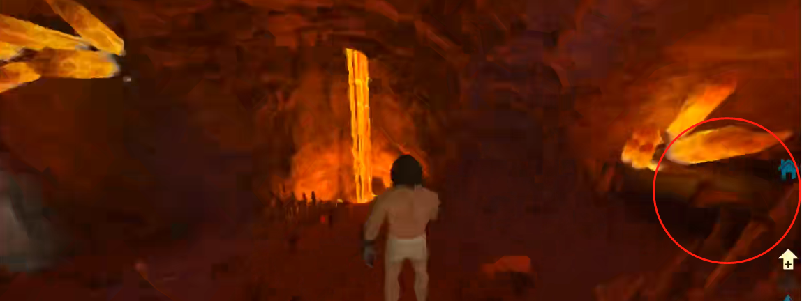 3、继续向前看到流动的岩浆,这里有左右两条路可以选,我们选择走右边。