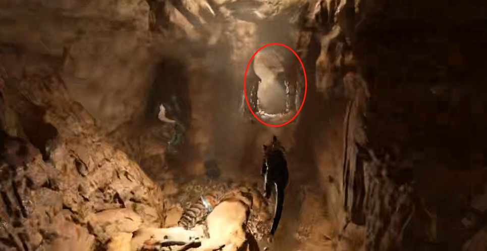 5、之后一直向前,出来后看到一大片空间,可以在前方的小洞中看到岩壁神器,走过去将其拿去就好,具体坐标为35.1-28.0。
