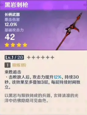 以上便是小编为大家带来的原神长柄武器黑岩刺枪的满级属性介绍,比较适合魈、罗莎莉亚、钟离。相信现在你已经了解到了黑岩刺枪的属性,更多武器属性敬请关注大三软件站。