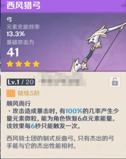 精炼(1/2/3/4/5)阶 顺风而行 攻击造成暴击时,有(60%/70%/80%/90%/100%)的几率产生少量元素微粒,能为角色恢复6点元素能量。该效果每(12/10.5/9/7.5/6)秒只能触发一次。 |