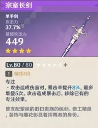 以上便是小编为大家带来的原神宗室长剑满级属性介绍,和刻晴、凯亚等角色比较适配,相信现在你已经了解到了宗室长剑的属性,更多武器属性敬请关注大三软件站。
