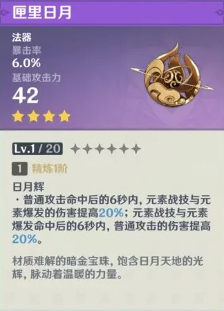 精炼(1/2/3/4/5)阶 日月辉 普通攻击命中后的6秒内,元素战技与元素爆发的伤害提高(20%/25%/30%/35%/40%); 元素战技与元素爆发命中后的6秒内,普通攻击的伤害提高(20%/25%/30%/35%/40%)。 |