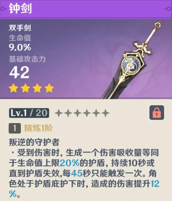 精炼(1/2/3/4/5)阶 叛逆的守护者 受到伤害时,生成一个伤害吸收量等同于生命值上限(20%/23%/26%/29%/32%)的护盾,持续10秒或直到护盾失效,每45秒只能触发一次。 角色处于护盾庇护下时,造成的伤害提升(12%/15%/18%/21%/24%) |