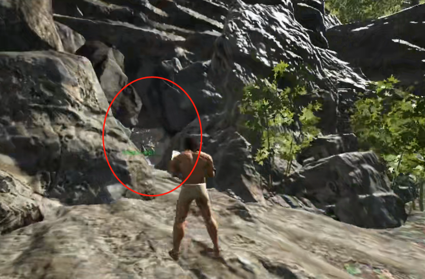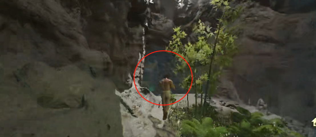 3、继续向前会看到一颗树,在树的这边往下面走,如图圈出来的位置。