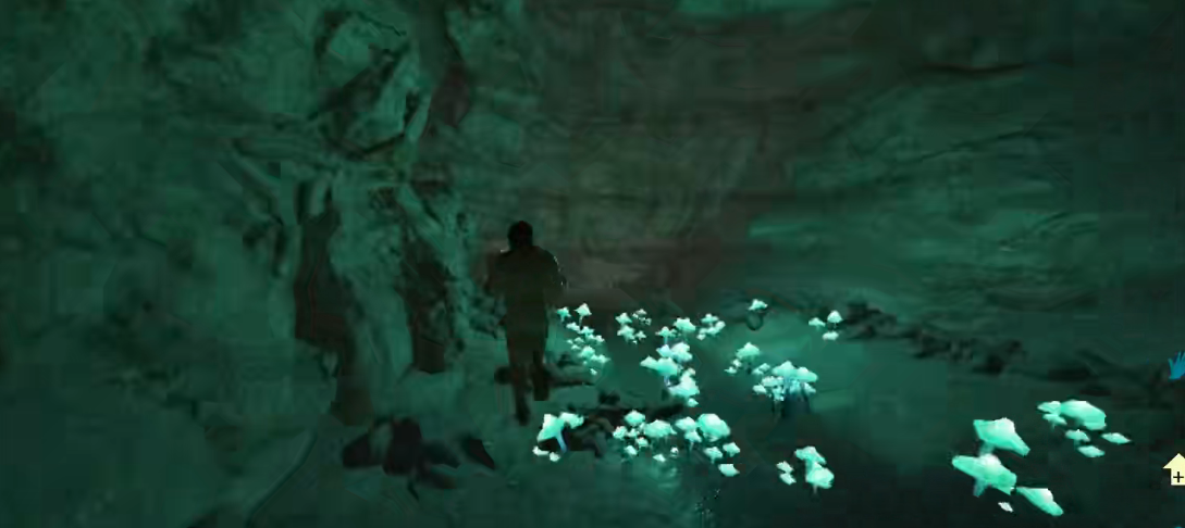 4、然后看到一片荧光蘑菇的地方,前面蹲下进去后就可以找到上古神器猎手,神器坐标为83.5-56.0。