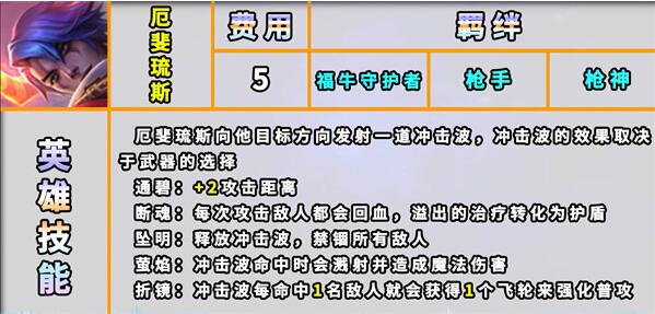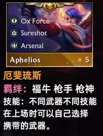 1、厄斐琉斯的羁绊是福牛守护者、枪手、枪神,他能根据玩家选择的武器决定技能效果。