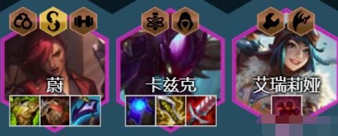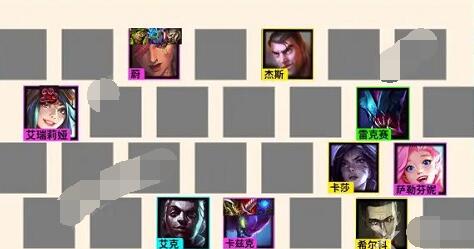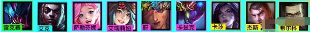 雷克赛、艾克、萨勒芬妮、刀妹、蔚、拼多多螳螂、卡莎(可用卡萨丁代替)、杰斯、希尔科(9人口)