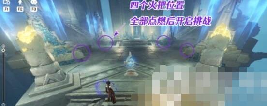 1、在平台点燃4个火把,基本四波魔物,这时屏障就消息了,我们爬到雕像上去触碰高天之火就可以了,无先后顺序。