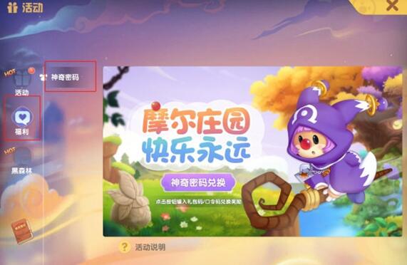 点击右上角活动中的福利,再点击神奇密码,输入神奇密码即可进行兑换。