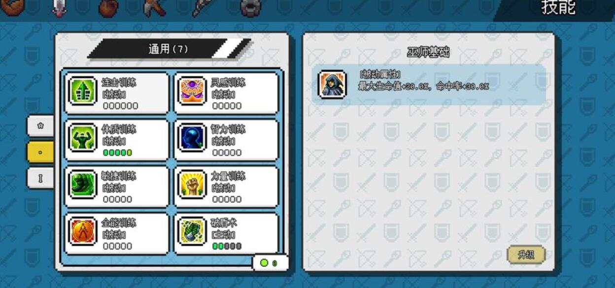 3、首先把主动点下,提高参与度,然后把巫师学徒”的面板被动加一点,然后加“体质训练”和“体指”。