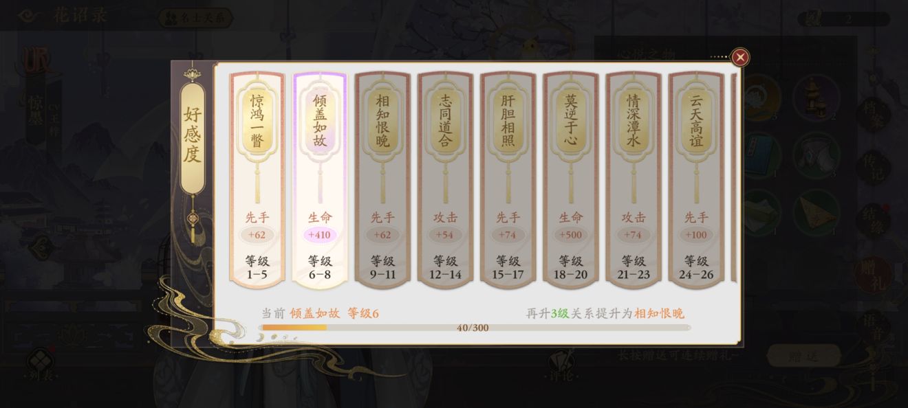 1、玩家提升角色的好感度可以获得一定的属性加成,玩家可以先怼满品质最高的主卡,再提升其他角色的好感度,如果有其他UR喜好礼物的话,可以按照喜好表来赠送提升好感度。