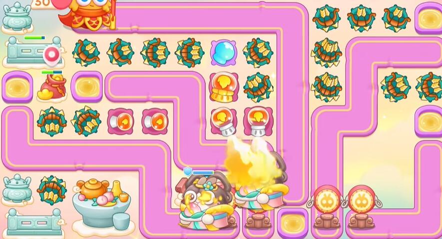 3、把荷花缸打掉之后,快速建立喷火器、雪球、多重箭,多重箭打钱袋。