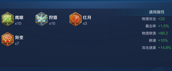 4、第二套铭文搭配:10红月、10狩猎、10鹰眼