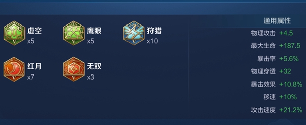 3、第一套铭文:7红月+3无双、10狩猎、5鹰眼+5虚空