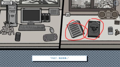 6、之后如图点击桌面上的物品,下方对话框中负面的话不要点击。