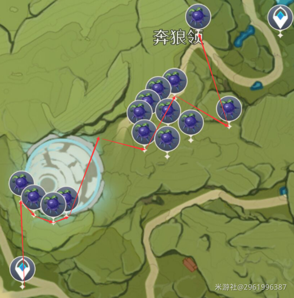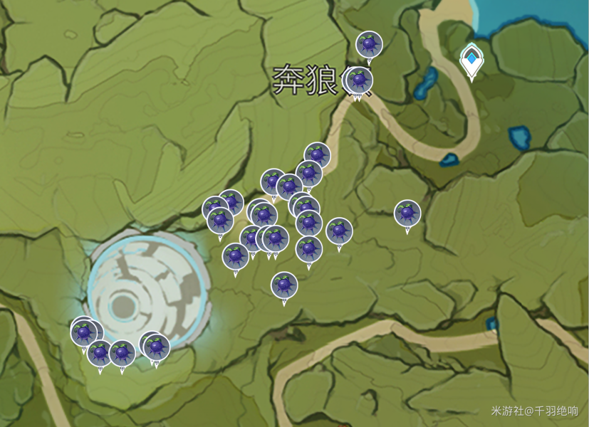 只有奔狼领这一块有分布,推荐使用七七或者可莉,带上他们小地图会有小手,帮你查询钩钩果的位置。