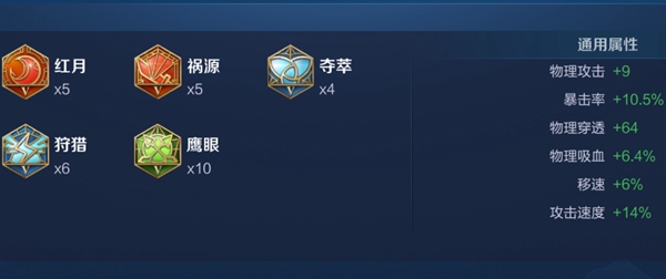 3、第一套铭文:5红月+5祸源、4夺萃+6狩猎、10鹰眼