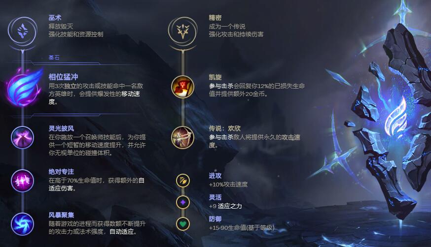 (1)主系符文:巫术+相位猛冲+灵光披风+绝对专注+风暴聚集;
