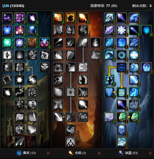 冰法是法师3系中最适合练级的专精,可以拉很多的怪来风筝,生存能力也很不错,加点如下: